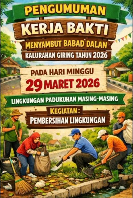 Pada hari Minggu, tanggal 29 Maret 2026, Warga masyarakat Kalurahan Giring, semua bekerja sama untuk melaksanakan gugur gunung/ kerja bakti di Wilayah lingkungan Balai kalurahan Giring, di Wilayah sekitaran Pertigaan Giring, Kali Gowang, Taman Giring dan rumah2 yang dilaksanakan oleh semua warga masyarakat untuk menyambut acara Babad Dalan yang jatuh pada hari Jum'at Kliwon tanggal 4 April 2026.